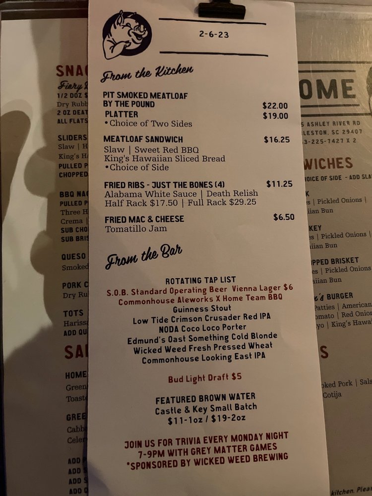 Introducing Home Team BBQ, a beloved spot in Charleston for barbeque enthusiasts. Located at 1205 Ashley River Rd, this restaurant offers a variety of options including delivery, takeout, and catering. With a casual atmosphere and outdoor seating, it provides a cozy vibe perfect for lunch or dinner. Customers rave about the flavorful dishes such as the Home Team Salad with smoked turkey, brisket tacos, and smoked chicken wings. The menu also features vegan and vegetarian options, making it inclusive for all. Don't miss out on their signature sides like tater tots and mac and cheese. Whether you're a fan of BBQ or looking to try something new, Home Team BBQ is a must-visit destination with excellent service and a fun atmosphere.